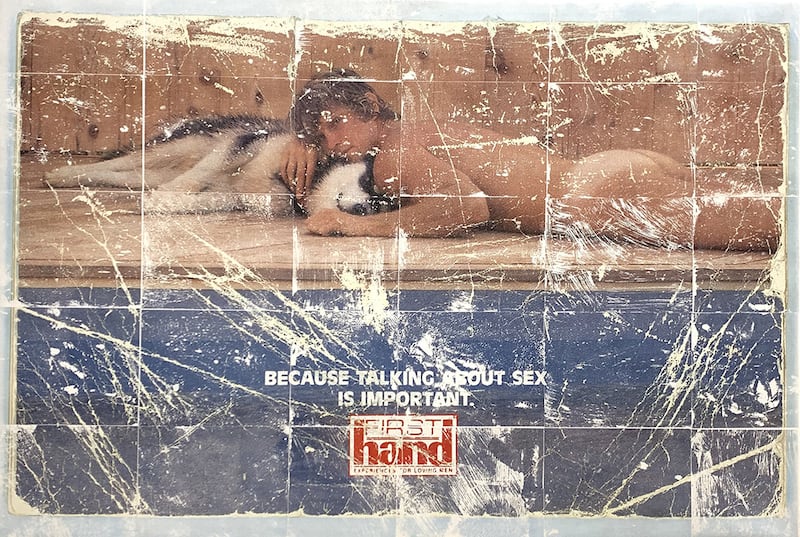 Now on view at Paris London Hong Kong, Learning to Cry Like River in Spring is a new series of paintings by Colombian artist Leonardo Kaplan. This body of work is based on a series of public service announcements that were printed on the backs of the gay pulp erotica magazine First Hand Experiences For Loving Men during the 1980’s and 1990’s. The announcements were intended to encourage open and positive dialogue about HIV and AIDS, as well as defining acceptance for queerness in general. The artworks themselves are produced by scanning the highly distressed surfaces of the original magazines, and creating a hand-applied transfer, which is then applied to a sanded gessoed canvas. The enlarged scale humanizes the featured subjects, and heightens the physical affectation of these image objects, as well as their production value, materiality, and economy.