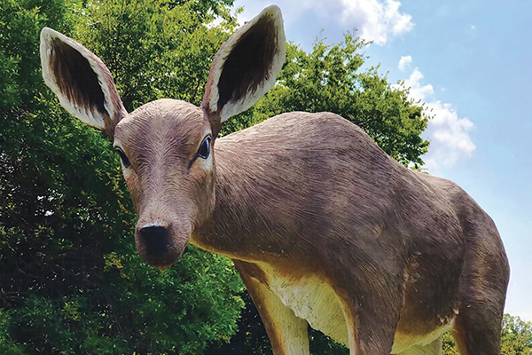 Tony Tasset, Deer, 2015, fiberglass, steel, paint, 12 x 20 x 8 feet. On view at the Laumier Sculpture Garden.