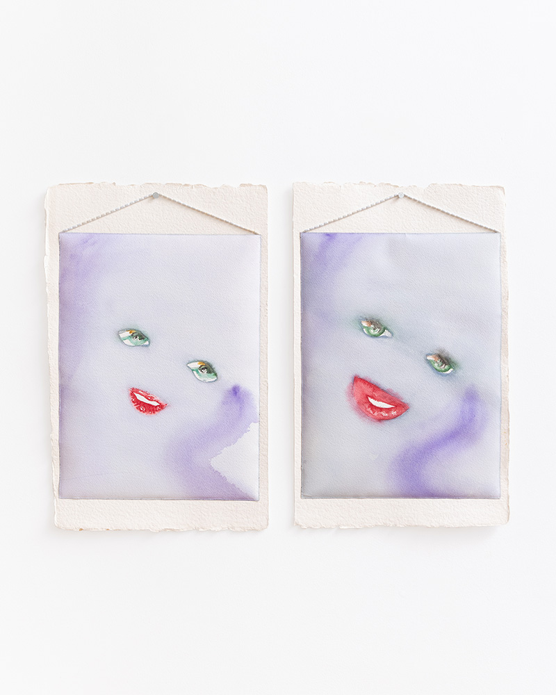That high-intensity lens shifts from the clinical to the tactile in Andre Walker’s “Iggy and Bliss: Visible Timeline” diptych. Against a soft violet background, the green eyes and juicy red lips jump out at you—the lips have the hyper-real, silicone look of girls with fresh lip filler. Walker’s work sits in that sweet spot between fashion and fine art; instead of sticking to a flat canvas, he builds the piece by sewing on the watercolors and stuffing them like a quilt. It’s a clever, hands-on technique that hits the “Bias Cut” theme perfectly, playing with the way fabric—and art—can be draped and manipulated.