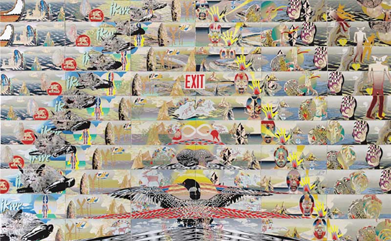 Andrea Carlson, Red Exit, 2019, acrylic, ink, oil, gouache, watercolor, colored pencil, marker and graphite on paper, 10’ x 14’. Collection of Whitney Museum of Art