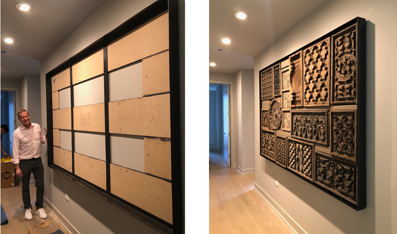 Above: Pre-work as well as the final results for a custom installation for a client. Golden Triangle fabricated a custom art piece from vintage Indian cement molds for a the entryway to a client’s modern condo, hiring a local metal worker to make the frame. VanTress says, “Ancient and modern projects take the edge off of modern (sometimes sterile) interiors.”