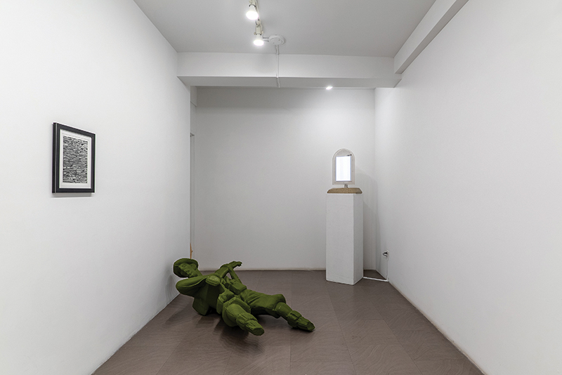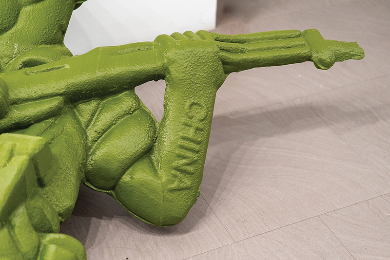 Upon discovering a damaged, discarded Army Men toy on a Chicago sidewalk, Pierce was inspired to create a scaled-up replica of the compelling footless soldier. A local engineering firm that conducts industrial scans performed a CT scan of the toy soldier, enabling Pierce to create an identical larger 3D-printed version. Untitled (army man,) is a green 3D-printed sculpture (65” x 48” x 18”) stamped with CHINA, referencing its origin and themes of global production and commodified war imagery. Pierce regards the human-sized sculpture as commentary on the monstrosity of war and its consequences. The nearby display of the original toy prompts viewers to consider its role as a symbol of conflict.