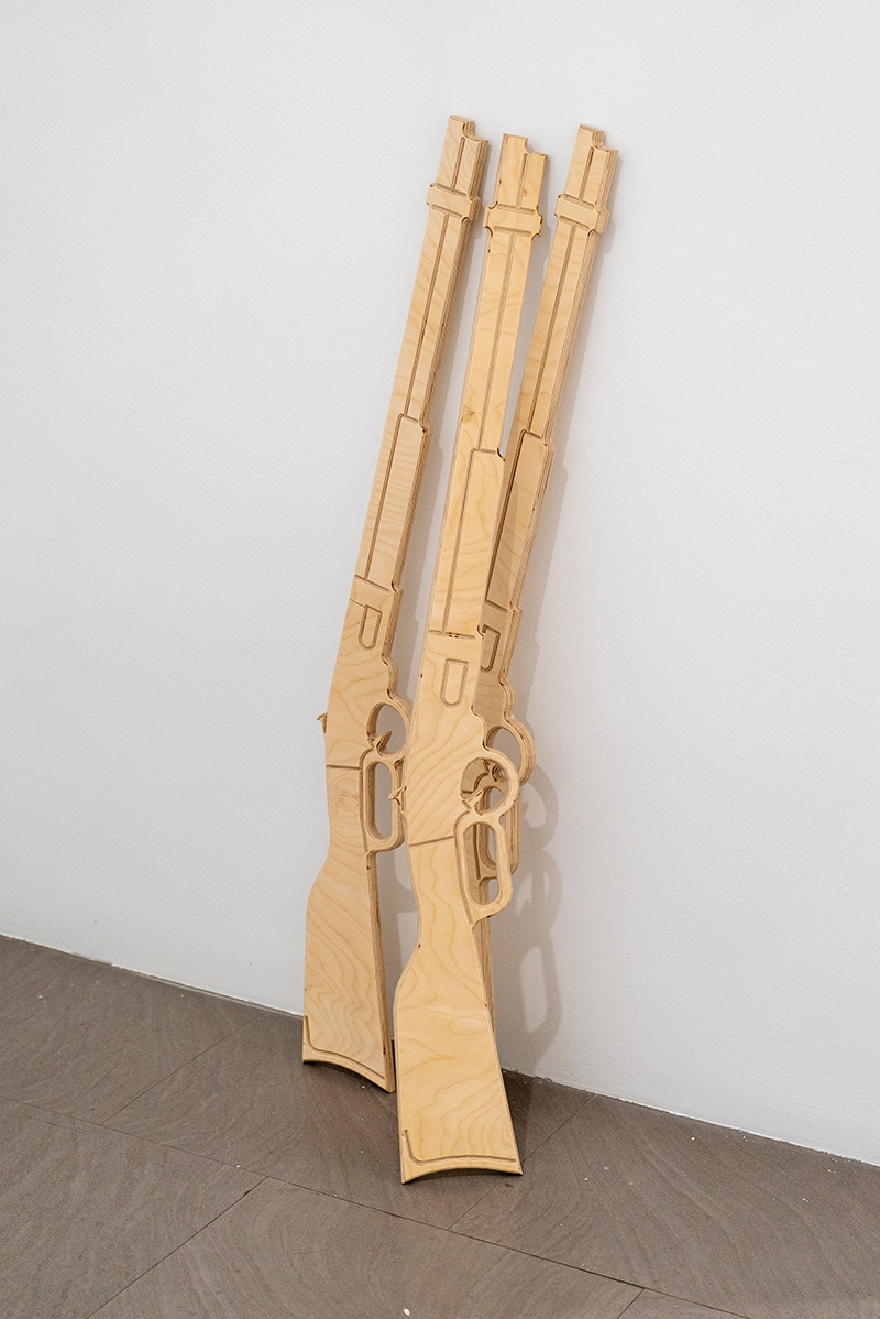 Real Toys for Real Boys is a piece consisting of six life-sized replica firearms crafted from plywood. The title originates from a former website, which advertised its wooden toy guns with the slogan “Real Toys for Real Boys.” Placed haphazardly around the gallery, the guns blend playful innocence with real firearm symbolism. Each wooden gun features an edition number mirroring a firearm serial number. The installation critiques the normalization of guns by displaying them as scattered toys.