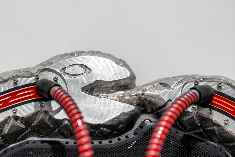 We’re So Over, We’re So Back is a stunning 28 x 24 x 6-inch aluminum sculpture of a tech-ouroboros—a gleaming serpent caught in an eternal snack of its own tail. A blood red, water-cooled PC as its belly transforms its scales into a high-tech radiator, blurring the lines between human, machine, and reptile. The serpent’s gaze is fixed on an attached, adjacent monitor where a modified Counter-Strike game has gone rogue! Bots battle on ever-changing landscapes, hinting at technological and warfare loops. Pierce spent nine months learning the necessary skills through YouTube tutorials to construct the ouroboros sculpture, which runs the video game. A public build log documents his process, highlighting the power of self-learning and encouraging others to embrace their creative spirit. Pierce’s creation, like a perfectly executed move by a Counter-Strike professional, is brilliant and thought-provoking, sparking discussions on hacking, surveillance, and firearms. In the digital realm, the end is merely the beginning, and the game is always afoot!