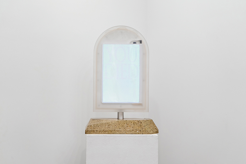 Top: KDR, 2025, OLED gaming monitor, acrylic, polished concrete, laser cut aluminum, vacuum formed ABS, 3D-printed ABS, modified monitor mount, Raspberry Pi Zero 2 W, stainless steel hardware, HDMI cable, USB-C Cable, 20v AC adapter, DC step-down converter, heat-set inserts, wiring, ghosts, 25 x 17 x 11”.