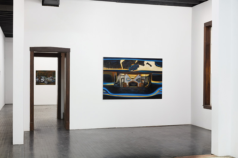 Installation view at M. LeBlanc. On wall: Marika Thunder, Egyptian Chevy (2024 -2025), oil on canvas, 48 x 72 in (122 x 183 cm). In far room: Marika Thunder, Demolition Derby, (2025), metal and oil paint on aluminum, 24 x 36 in (61 x 91 cm). Photography by Ian Vecchiotti