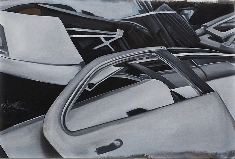 Marika Thunder, Car Doors B&W (2025), oil on canvas, 24 x 30 in (61 x 76 cm)