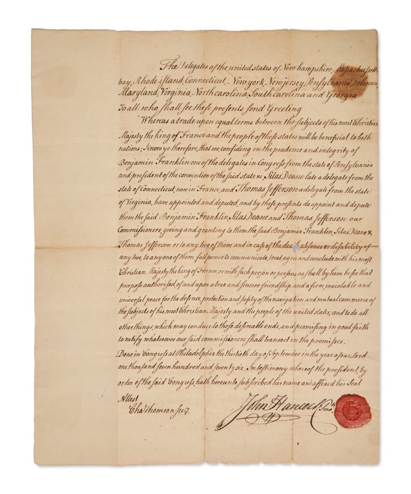 Lot 29: Letter of credence appointing Benjamin Franklin, Silas Deane, and Thomas Jefferson commissioners to the court of France to negotiate a treaty of alliance, September 30, 1776" | Estimate $150,000 – 250,000