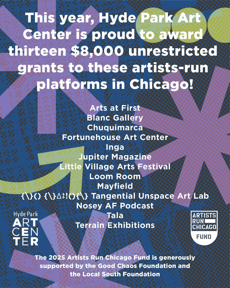 Hyde Park Art Center has announced the sixth round of its Artists Run Chicago Fund, awarding $104,000 in unrestricted grants to 13 independent artist-run platforms across Chicago. Each recipient receives $8,000 to support operations, programming, and artist-led initiatives.