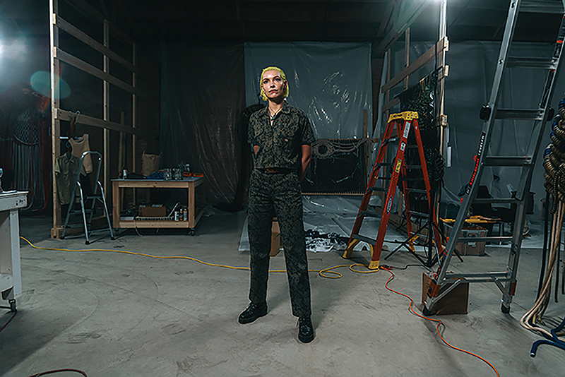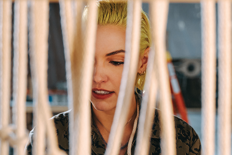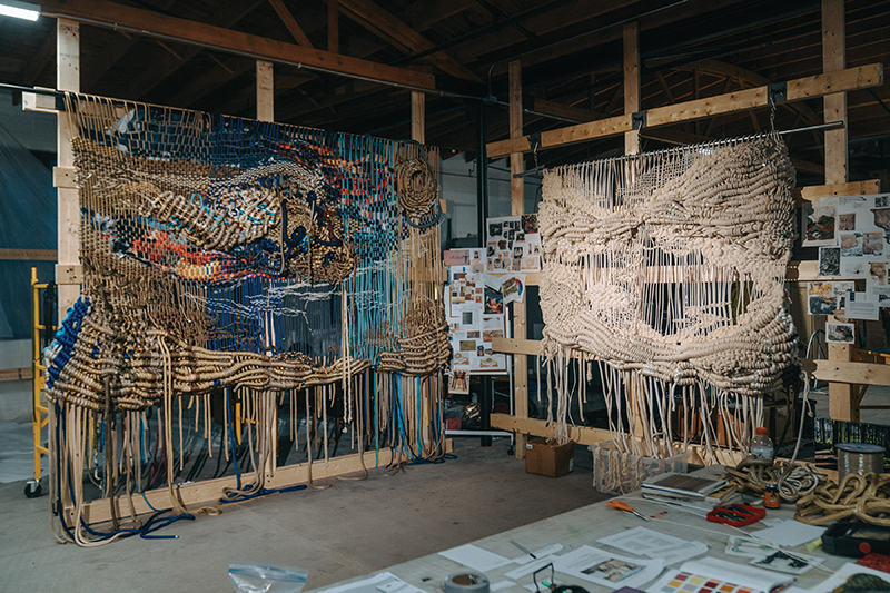 JS: When I’m setting up, I’m building looms, ordering all these materials, trying to make sure I’m going to get all the packages in time, laying out the plastic, cleaning everything. And then once I’m set up, it kind of looks like a shit show in there, but basically I can stand in one place and reach everything I need. It might look crazy, but for me, it’s the perfect amount of controlled chaos. I usually get there around one or two p.m. and then work until midnight.
