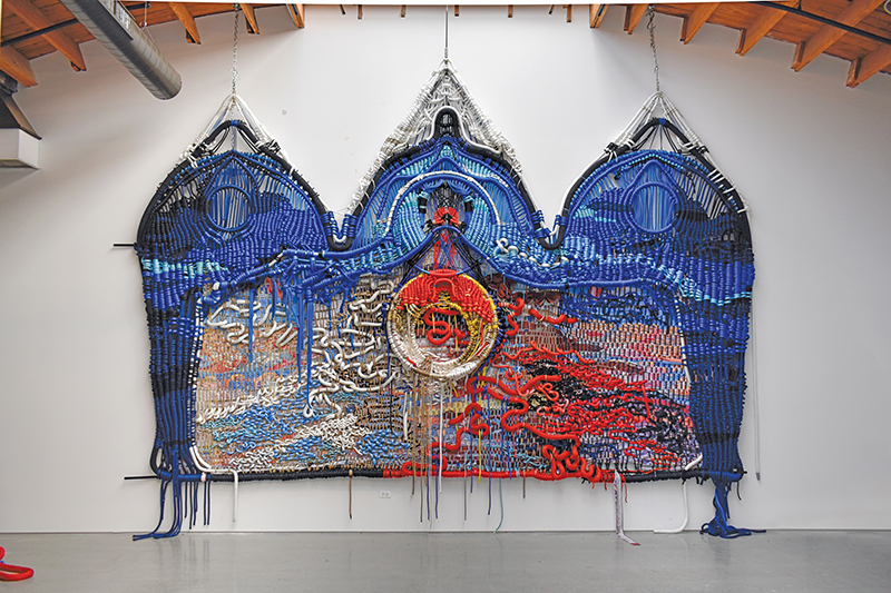 The first one I ever made was at Occidental, and it was a five by five foot piece, because I was painting on the other side of the canvas. I was looking at the weave of the canvas, and it was not happening, the painting was not good, and I could not figure it out. I knew I wanted to do something in landscape, but I didn’t know exactly what I was trying to say. Even just physically, it didn’t feel good or look good. I was looking at the grid of the canvas, thinking about why L.A. highways look the way they do and what a grid in a city means. I had never thought about Chicago being on a grid and then suddenly thinking everything is on a grid. Looking at Anni Albers and those kinds of artists and conversations around the grid from a weaving perspective. I flipped the canvas over, and I made a peg loom on the other side. The grid’s a really strong structure, and I thought I can evolve this, make it bigger.