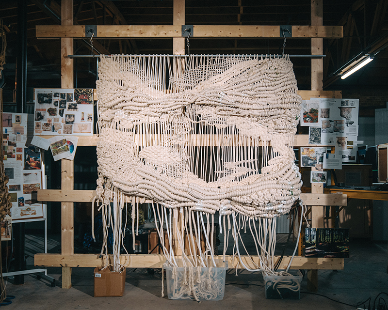 A lot of it is just the labor of getting started, which is again the loom process, and then there’s this period once they’re well on their way, well formed, on the loom, and I take them off the loom, and it’s this very dramatic thing. They’re hundreds of pounds, dangerous, and we’re all like ahh! Things go everywhere. Then I string a pole through the top and hang it, usually with the help of two or three people, and then see how the tension or lack of tension changes the forms. I re-approach [the work] and make more photographs, collages, and sketches. I’ve been sketching a lot of bark and trees that might not necessarily be seen in the pieces themselves, but it’s helpful for me to just think through where I want them to go—how landscapes speak through absence.