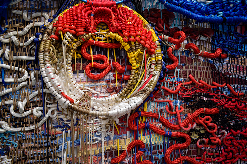 Above: Jacqueline Surdell, Suddenly, she was hell-bent and ravenous (after Giotto), 2024. Nylon cord, steel, polyester fabric, steel spool top, steel chain and meat hooks. 65 (body) x 252 (pole to pole) x 7 inches. Below: Detail of Suddenly, she was hell-bent and ravenous (after Giotto).