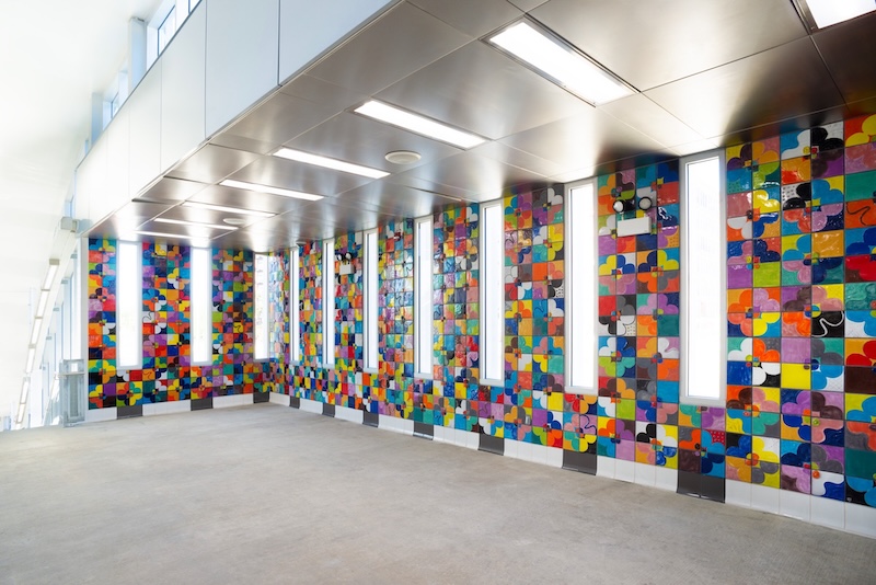 Titled Flowers for the Blue Line Racine Station, the work stretches across 40 feet of wall space, wrapping the station’s north and west walls in 704 hand-made tiles. This joyful burst of color and pattern transforms a daily commute into something worth slowing down for and also offers a chance to engage with art daily.