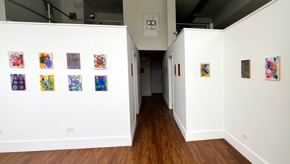 Watershed Studioworks in Chicago's Avondale neighborhood is hosting "Tessercats," an exhibit by Erik Wenzel with nearly 40 feline-inspired portraits informed by theoretical mathematics, and hyperspace. Established in 2019, Watershed Studioworks operates as an artist-run gallery and studio workspace. Co-owned by visual artist Kelly Rickert and Sarah Bordson, the gallery showcases art that promotes community engagement and meaningful dialogue. Wenzel relocated his studio to Watershed Studioworks during the pandemic and started working on these paintings. The gallery is an intimate storefront space with large windows and natural light, and an ideal venue for exhibiting Wenzel’s small but mighty Tesser-cats.