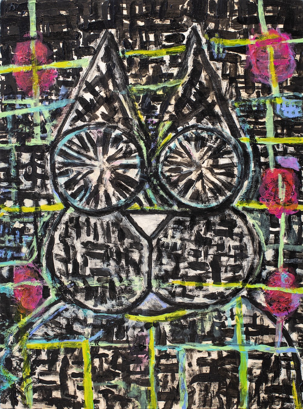 Many works feature spiral-patterned eyes, reflecting Wenzel’s focus on mathematics and geometry, and recalling the retro1960s Spirograph toy. These dreamlike swirling-patterned eyes also evoke the bold, psychedelic aesthetics of the 1960s and 1970s (think acid trips!) Examples include “Snow Pea,’” “Mascara Fresco,” “Mr. "Stripes,” and my favorite, “Trellis Tra La La.” The latter, created in 2025, is an acrylic painting rendered in black and white, depicting a cat with predominantly black, spiral-shaped eyes. The composition includes yellow and teal cubes and intersecting lines, dynamic gestural marks, and pinkish-red circles.