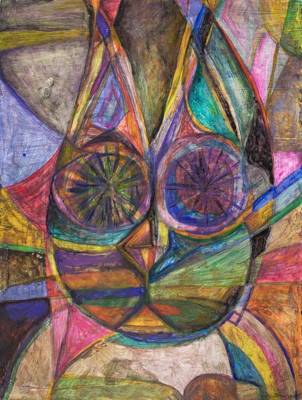 The paintings are fantastic and fanciful, but it’s the eyes that fascinate me. They are skillfully rendered, effectively embodying the sentiment that "the eyes are the window to the soul," a phrase often attributed to William Shakespeare. Some eyes are abstract, multicolored, or tie-dye-like patterns, while others are monochromatic. These portraits require close observation to appreciate their curious details. For example, “Lindner,” features pinwheel-patterned eyes: one contains two tiny tent-like pentagons at its center, the other a small gem-like hexagon.