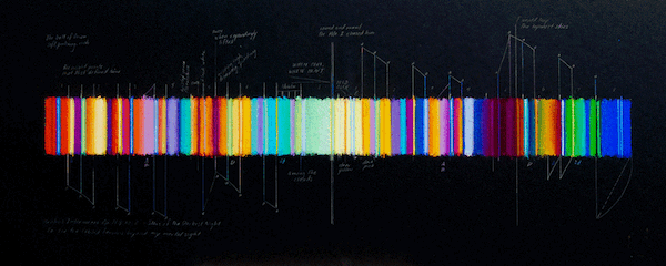 The pastel drawings in All I Wish to Own represent the progression of harmonies in a late piano Intermezzo by Johannes Brahms. Essentially, they are visual music, conveying the continuous motion and contours of the music in a linear pattern with consistent correlations between harmony and color.