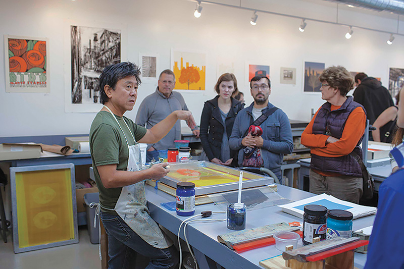 Hiroshi Ariyama demonstration of screen printing at Chicago Printmakers Collaborative during Open House Chicago