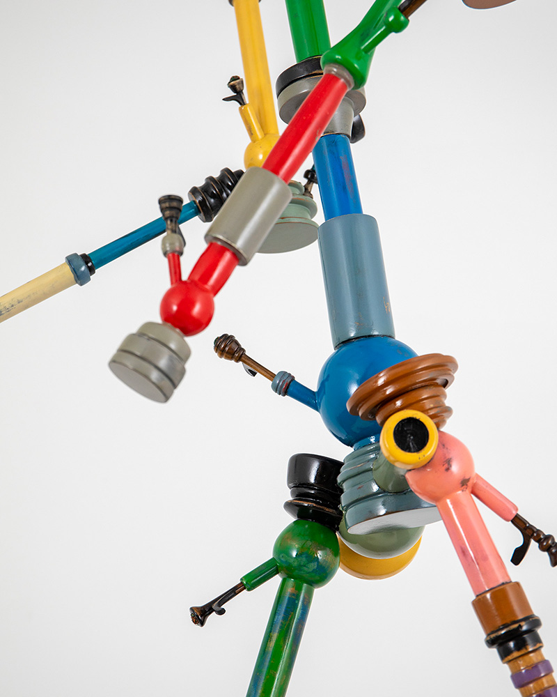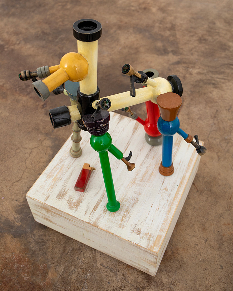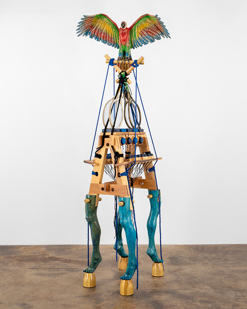 Arguably the show's most intricate and deeply personal work is Everything Needs Something Holy Ghost Oxford Commas (A Simple Heart). Reaching an impressive 10 feet, 1 inch in height (32” x 23” at the base), this tantalizing sculpture alludes to a bold and unapologetic intimate experience. Its foundation is rooted in Rea's own anatomy, with the base created from four vivid blue replicas of his left leg that he cast himself, each detailed with a subtly sexy fishnet imprint. These 'legs' support a structure that evokes a BDSM or restraint-focused apparatus; a wooden vibrator sits centered atop the bench. The sculpture pulses with layered symbolism. While the tennis rackets are personal symbols of Rea's hobby, they could just as easily be interpreted as paddles. At the top sits an exotic parrot, wings spread, seemingly captured in a moment of intense excitement or pure ecstasy. The sculpture operates on multiple levels of intent; Rea notes the piece is “bound together aesthetically and literally structurally,” making it a compelling—and visually potent—focal point within the exhibition. The work is an audacious, unblinking piece that compels a reaction from every viewer.
