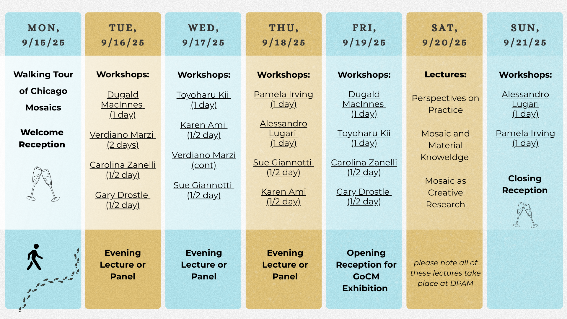 For the visiting artist workshops, you will build your own class schedule for each day. Please respond to the info@chicagomosaicschool.org confirmation email with your chosen workshop(s) to secure your spots.
