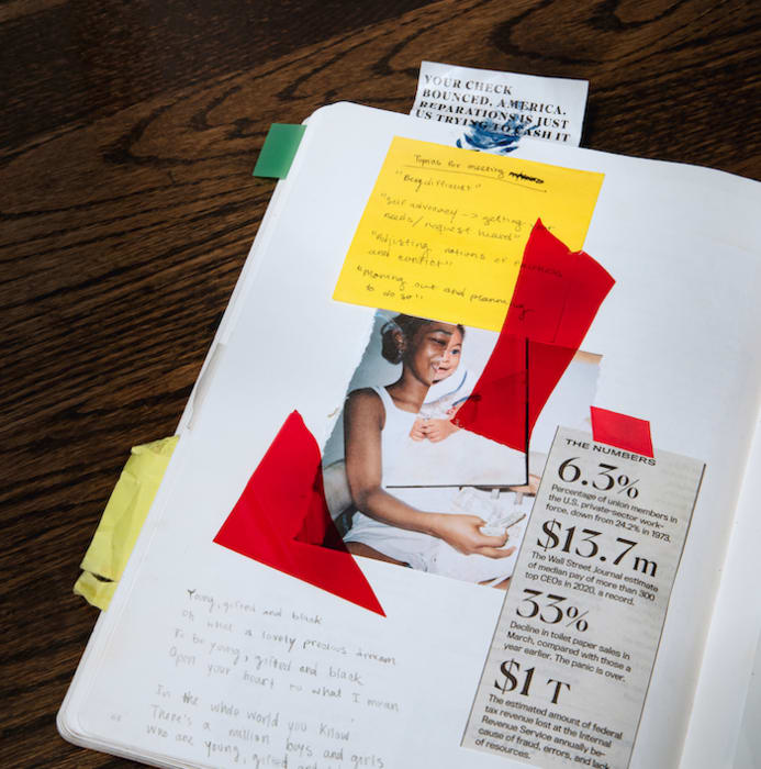“...when I heard the New York Times Daily Podcast in a coverage of the Breonna Taylor story, I thought, "When not a better way to connect with this woman who I saw so much of myself in, and to also embrace the power of scrapbooking, not just as this catchy or cheesy thing that maybe they do out in the suburbs, but as a way to think about my past, think about my present, and to really shape my own story and my own narrative for myself " , Harris explains here.