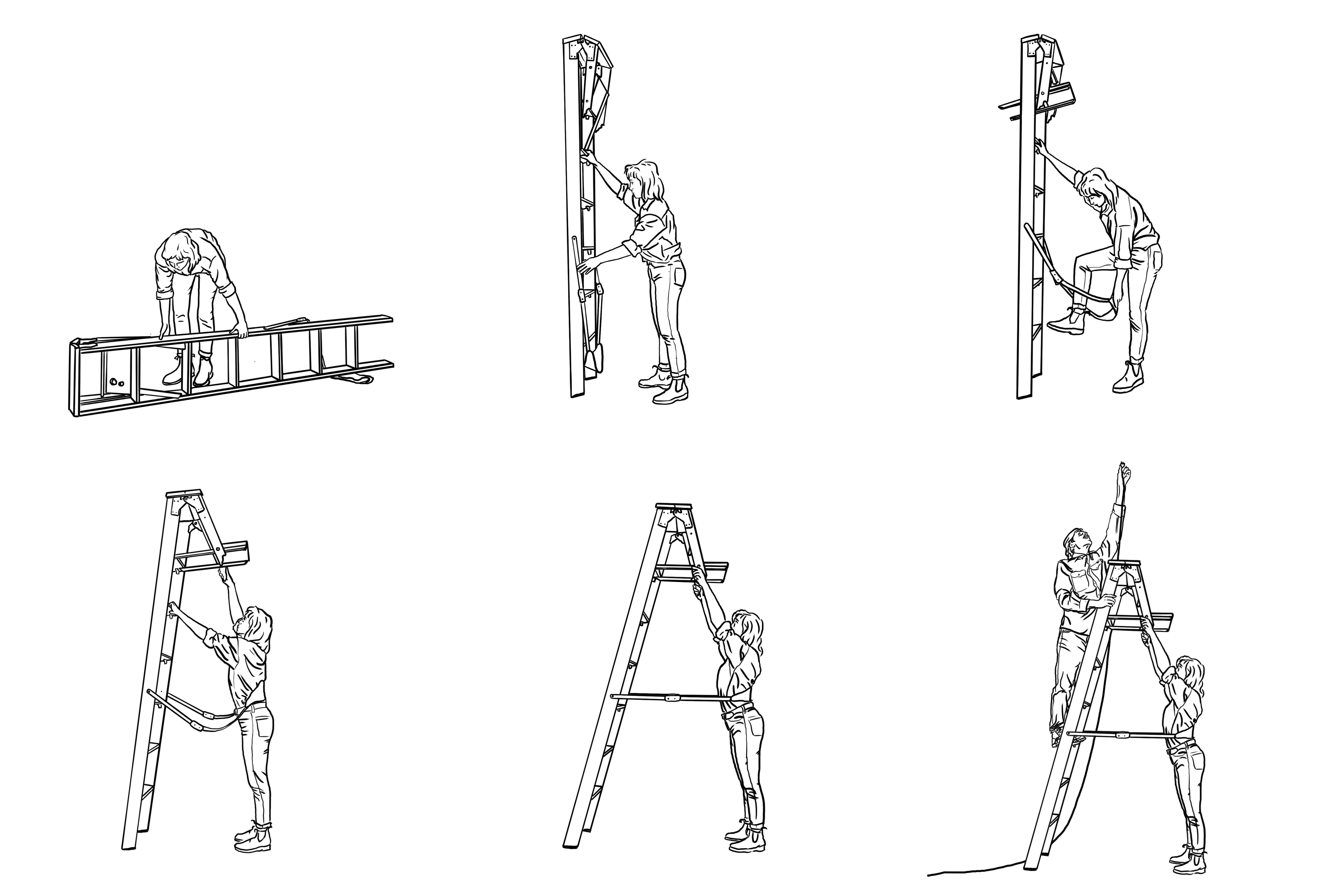 In Crist’s work “Ladder” the artist has hand-crafted an a-frame ladder appears at first familiar. The work has conventional ladder rungs on one side, but the other side is abruptly shortened and terminates in two handholds carved to fit Crist’s own hands. The piece only functions when Crist physically intervenes: she straps herself to one side, holding the structure steady above her head so another person can climb. That literal dependence makes the work a wry interrogation of the “ladder” as a metaphor for upward mobility and hierarchical progress. Crist transforms a ubiquitous image of success, rungs, ranks, reaching the top, into a staged dependency: she is simultaneously the wall the ladder leans on, the support that enables advancement, and a laborer charging for her service. The work folds wordplay and labor politics together, asking who holds us up and what we pay for that support.