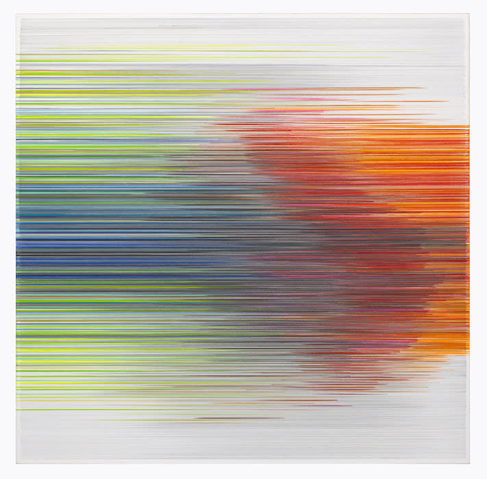 Contextually placed and presented within our new world order, Lindberg’s small mostly square drawings, made with graphite and colored pencil, quantify a particular shared moment, express an exploratory tone and represent Lindberg’s experience therein. Advancing her use of abstraction and emotive fields of lines, these drawings continue to explore atmospheric, rhythmic layers of luminous color. Importantly, the objective capacity of what these formal drawings represent directly relates to when and where they were made.