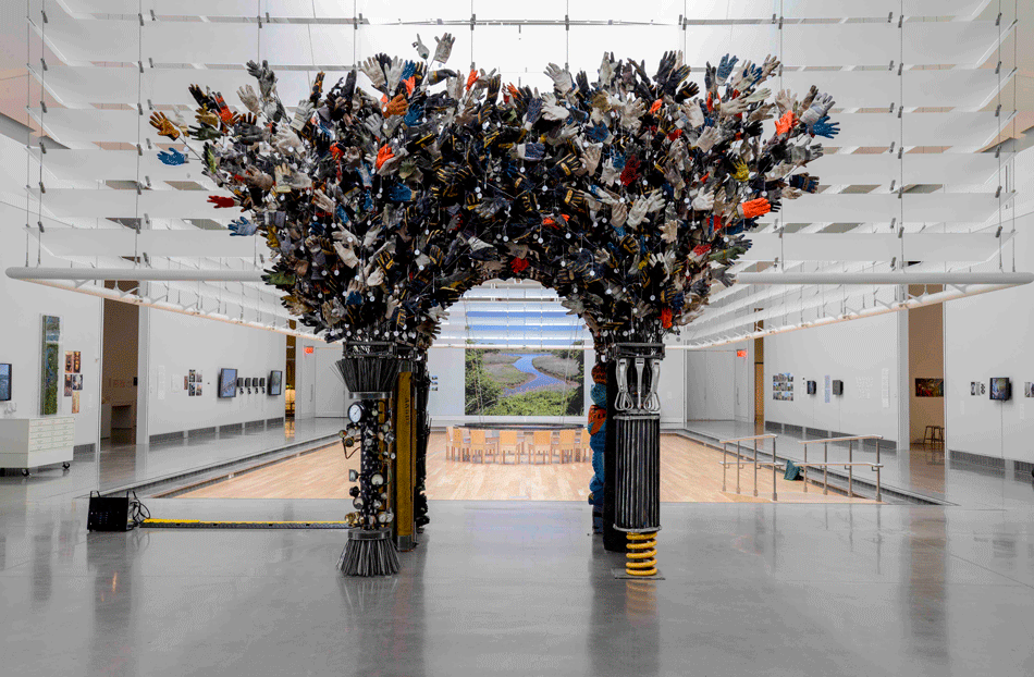 Image: Image: Mierle Laderman Ukeles, Ceremonial Arch IV, 1988-2016, 5000 gloves, steel cages, steel rods, six columns with agency-emblematic materials. Installation view at Mierle Laderman Ukeles: Maintenance Art exhibition, Queen's Museum, September 18, 2016 - February 19, 2017. Courtesy the artist and Ronald Feldman Gallery, New York