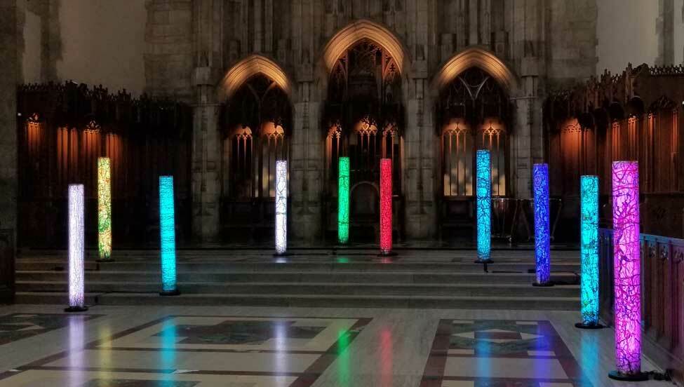 Each piece emits ever changing colors of light, just as we emit varying rays of connection to others. As the colors change, the images change dramatically. In this installation 10 columns, all of similar structure, but of different appearance, correspond to 10 individuals in an interacting societal whole. On many levels, these works address the origins of identity, and what it is that allows us to experience and learn from the world around us.