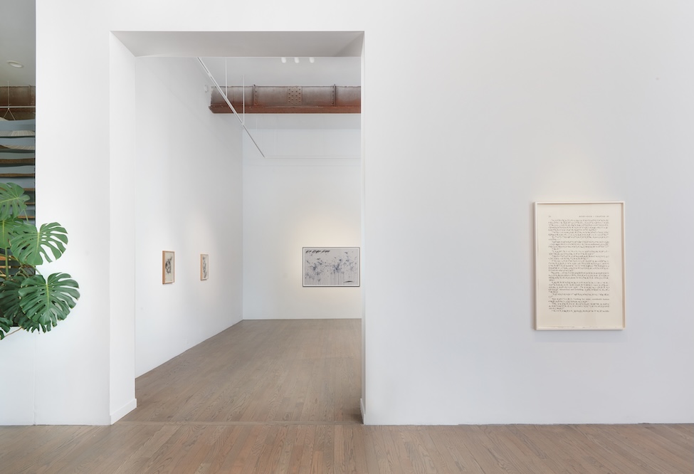 Orchestrating the heart of the exhibition are three new paintings from Collins’s The Battle Hymn of the Republicseries. Arguably the most familiar early American contrafactum—a song in which the melody remains constant while the lyrics are rewritten over time—versions of The Battle Hymn of the Republic have been adapted in support of varying political causes, including revolution, temperance, suffrage, labor, secession, and abolition, articulating often contradictory versions of what it means to be American. Emerging from cloudy, gray- washed backgrounds, Collins’s gestural marks form fragments of lyrical excerpts from alternate versions of the war-time anthem. The phrases included are drawn from adaptations of the song which lean on floral references as universal symbols of grief, renewal, and peace. Bleeding down the paper and abstracted into gesture, Collins translates the intended unifying voices of the lyrics' symbology into illegible noise.