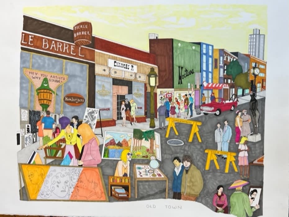 Maps have always appealed to me. The maps on the back of those Dell paperback crime novels, or the maps of imaginary worlds that were sometimes the frontispiece in works of speculative fiction by Edgar Rice Burroughs or Hugh Lofting or Hergé. Every map is both a surface and an interior. I used to spend a lot of time thinking about one map in particular, a mental image I tried to conjure up of every place of business that existed on Broadway between Oakdale to the south and Buckingham to the north circa 1966, which was pretty much my whole universe back then. I guess it is even now, as it is the genesis of these drawings. Altogether they form a map, whereby with pencil, pen and colored marker, I hope to share some stories with you of what it was like growing up in my old town. –Horberg