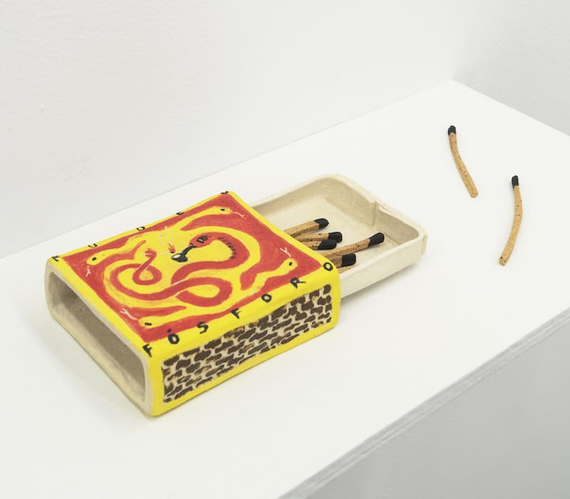 Image: Giovanna Pizzoferrato Ribeiro, Fudeu Fósforo - Questão Sobre Função (Brazilian Portuguese meaning: Everything’s Fucked Matches - Question of Function), 2020, 1” x 2.5” x 3.5”, glazed and unglazed ceramic, Photo by Paloma Dooley.