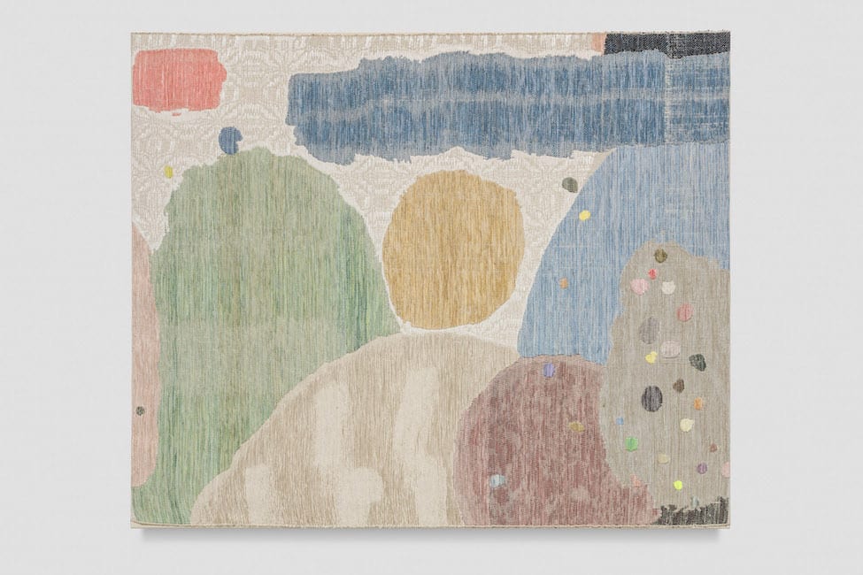 Across a suite of new works featuring the artist’s woven compositions of painted paper, Matson’s geometric abstractions allude to the history of the use of textile as a storytelling device. At once suggestive of either vast landscapes or closely observable patterns in nature—like the silhouette of mountains visible from a distance, or pebbles magnified under the clear glass surface of a slow flowing stream—the artist’s cellular and organic forms exact a realm where macro and micro phenomena coalesce. Through a material-forward and process-oriented approach, the colored lines of the artist’s handwoven tapestries are intertwined with that of the blank warp, resulting in optically mixed desaturated fields. The artist’s palette, muted hues of dusty blue, faint apricot, and warm earthen tones, adopt the influence of the Los Angeles-based artist’s immersion in Southern Californian light—bleached out apparitions weft into the structure of the image itself.