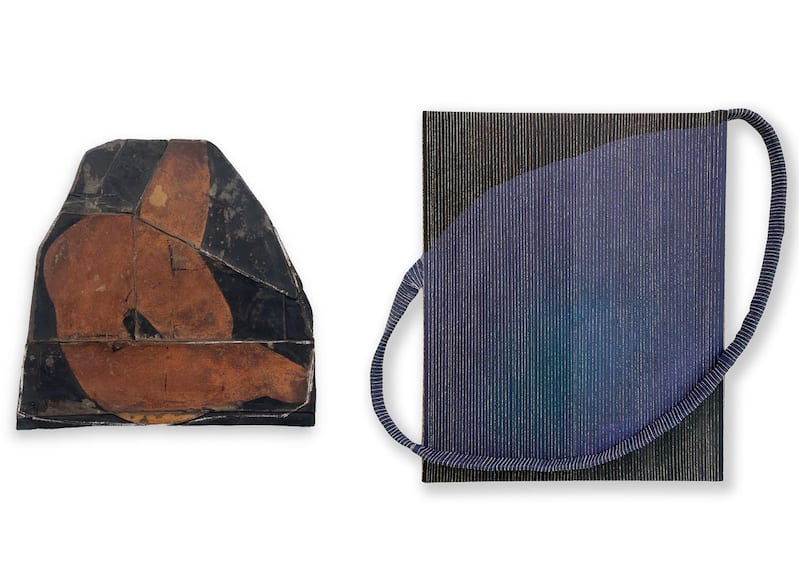 Right Image Credit: Jean Alexander Frater, “Vertical moons ago,” 40 x 42 in, Acrylic, latex and varnish on canvas, torn then woven, 2022