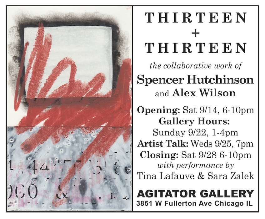 In 2023 Spencer Hutchinson and Alex Wilson collaborated on a series of artworks. Each artist started with a set of paper to which a base layer was applied. The two then exchanged sets and applied an over layer to finish. They then went through a process to select final works which were divided into two sets of thirteen pieces each. The sets, titled CHOICE and COMPROMISE, make up the total work of THIRTEEN + THIRTEEN.