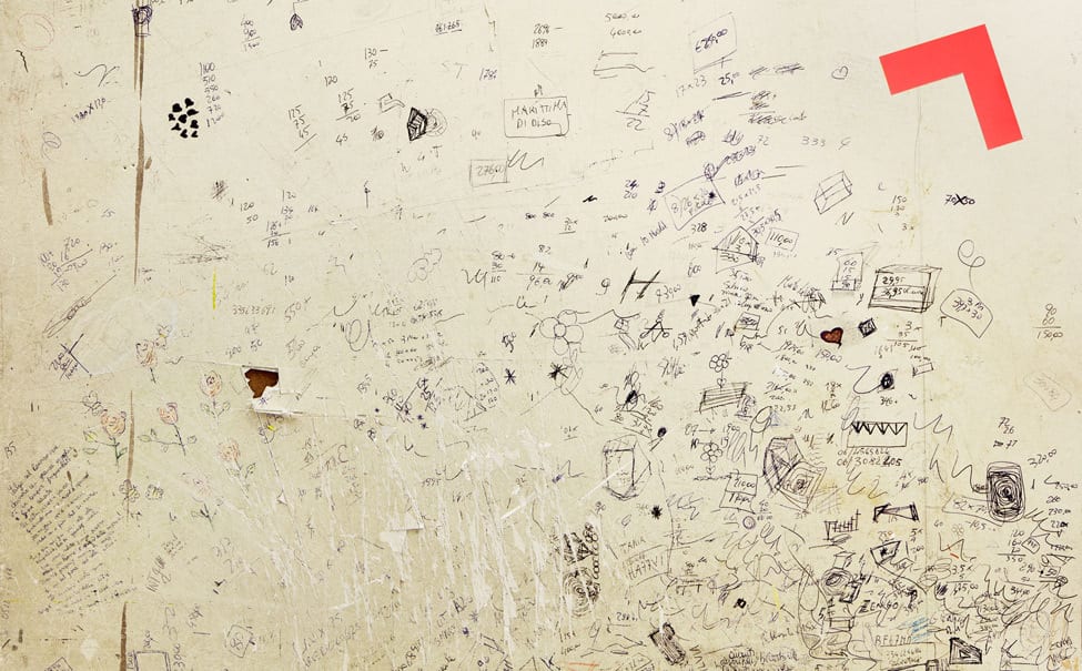 Tableaux continues his commitment to the people living in small towns in Italy, where human relationships are still the center of daily life. In Pergolesi’s newest series, he focuses his attention on the work surfaces that bear the markings and history of time. This can be seen in photographs of mathematical calculations, assorted tools used for framing, leather remnants discarded on the floor, and a paint splattered table that looks like a modern day Jackson Pollock. As he states: