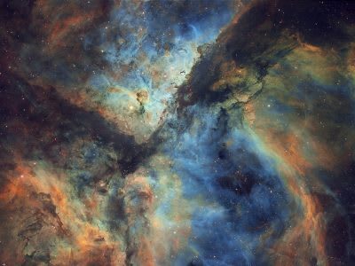 Space and earth-based telescopes look at a wide variety of the electromagnetic spectrum all the way from radio waves, through the visible spectrum to high energy gamma rays. They use filters or sensors of one sort or another to select for certain of these wavelengths. However when they want to represent this information in an image they are limited to the visible spectrum. Therefore the collected wavelengths, say in the infrared, need to be “mapped” to a color we can see. This mapping, sulfur ll=red, hydrogen-alpha=green and oxygen lll=blue, is commonly called the Hubble Palette.