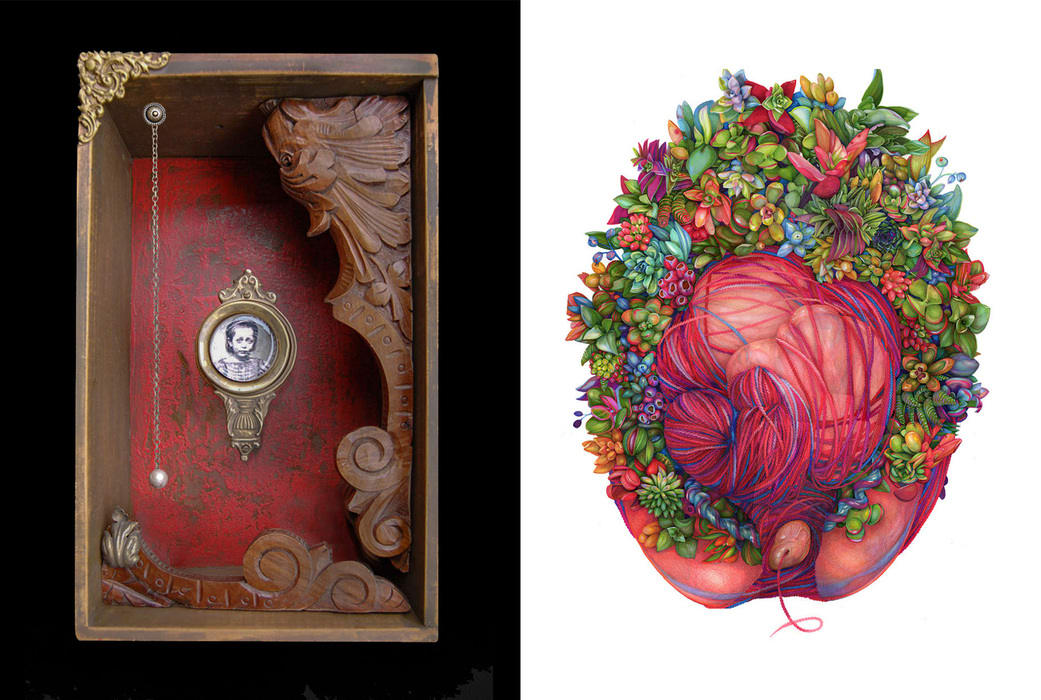 Tales Told is a 2-Person Exhibition featuring assemblage and collage work by Kass Copeland and color pencil drawings by Jillian Dickson.