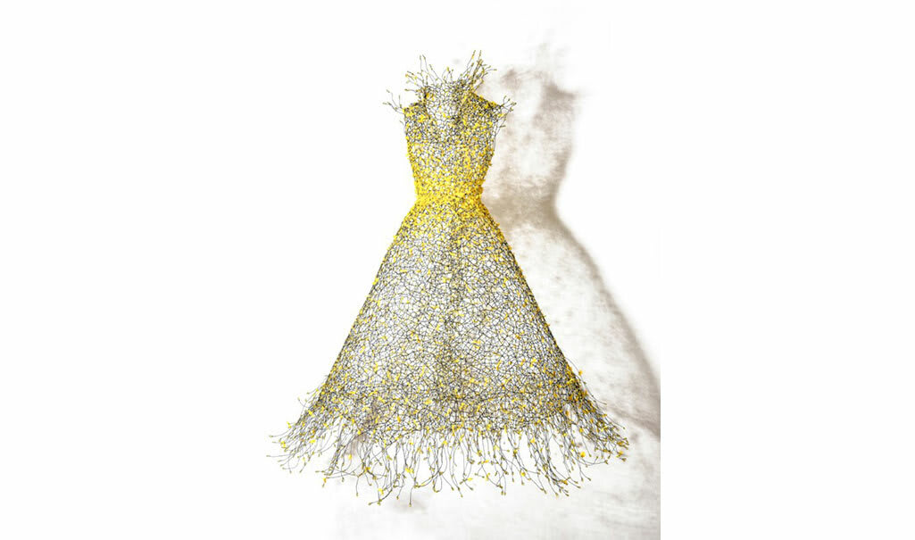 Image: KEYSOOK GEUM, Snow White in Yellow, wire with beads & yellow silk organza, 77 x 26 x 8 in.