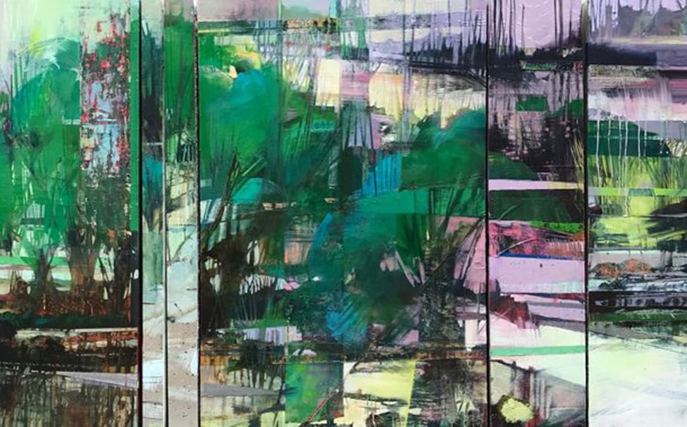 The exhibition will feature several new works which investigate the ongoing reorganization of our landscape due to both construction and conservation, while exploring the relationship between action and reaction. Curtis introduces construction and design materials into her work, forcing the developing imagery to adapt, preserved areas to be exposed and new histories to emerge. Elements are altered, repurposed, shifted, and combined resulting in compositions which range from graceful adaptation to abrupt disturbance. Utilizing elements such as ugliness, beauty, disruption and resolution, Curtis’ work reflects the information each of us absorbs as we move through our own surroundings. With Reconfigured, Curtis invites the viewer to consider the cumulative history of our spaces and provokes introspective contemplation about both predictable and unpredictable consequences.