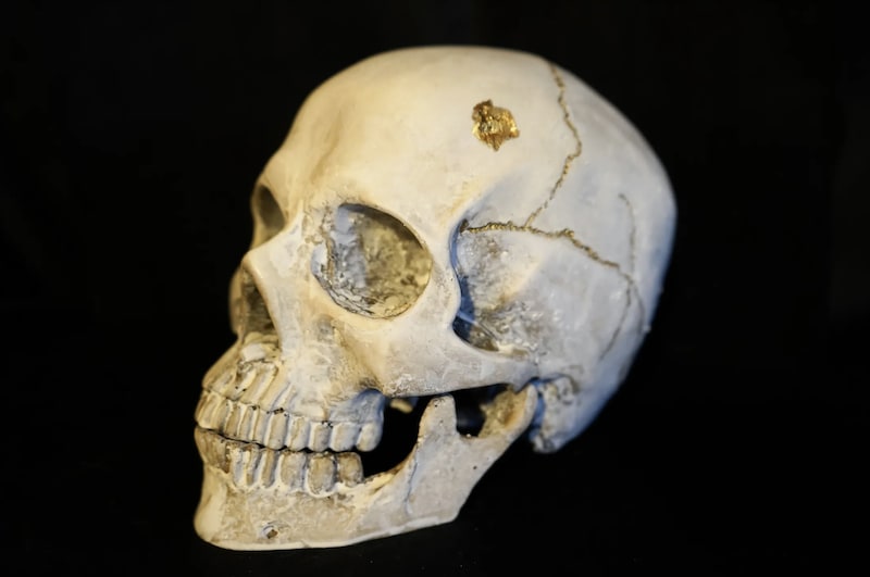 Image: Mami Takahashi. Kintsugi Skull 01, 2022. Resin replica skull, gofun (oyster powder), gold leaf, and gold powder. w 4 1/2″ x h 6″ x d 7″.