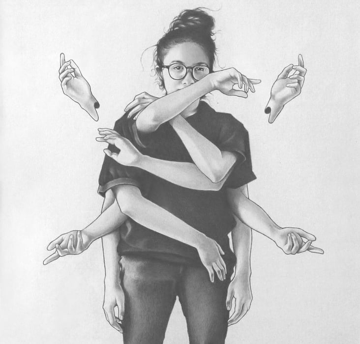 Kyle Cobban is a Chicago-based fine artist and high school art teacher in the city’s South Side. Cobban’s visual language evolved from years of observing his students as they grappled with the challenges of navigating their personal narratives. Working primarily in pencil, Cobban creates subtly surreal images that evoke both the strength and vulnerability essential for inner metamorphosis. Each drawing is an illusion of many beings compressed into one as hands and arms float around the core of each figure, searching for their center. Prioritizing line and tonal qualities, his realistically-rendered characters are contrasted with the emptiness of their white backgrounds. The juxtaposition of these static environments with more rhythmic features results in a subdued sense of movement within the works. Cobban often obscures the faces of his figures, creating a metaphorical mask that disrupts the typical power dynamics of subject and viewer.