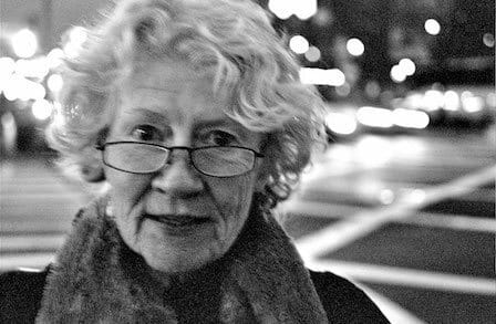 Image description: A black and white photograph of Jean Valentine, a White woman with short, curly white hair. She is wearing thin rectangular glasses and a scarf around her neck. The background behind her is out of focus. She looks directly at the camera. Photo copyright by Tyler Flynn Dorholt.