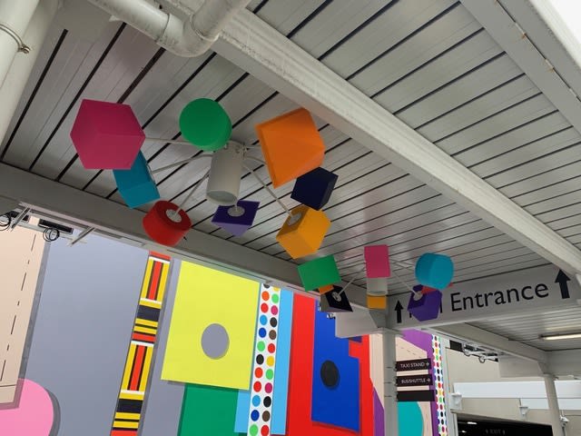 Derrick Adams’ 22-piece lighting installation, entitled Fashion Accessories, joins the artist’s existing seven-story, 4,082 square-foot mural, entitled Fashion Show, to transform Fashion Outlets of Chicago’s grand entrance. The lighting installation and mural are both inspired by Adams’ acclaimed Patrick Kelly series and the bold and colorful geometric forms that make up the legendary clothing designer’s patterns. The installation will illuminate the canopy of the grand entrance walkway and lead Fashion Outlets of Chicago visitors from the porte-cochere to the entrance of the shopping center.