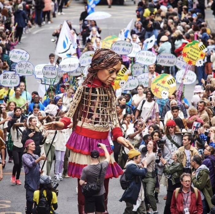 Little Amal - whose name means 'hope' in Arabic - is a 12-foot puppet of a refugee Syrian child who has traveled to 13 countries. She began her journey from the Syrian border and carries a message of hope for displaced people everywhere, especially children who have been separated from their families. Her urgent message is simple – “don’t forget us.”
