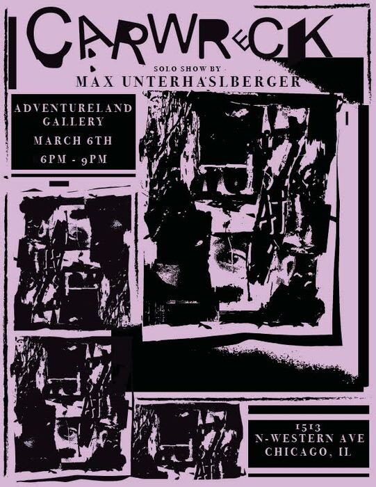 JOIN US MARCH 6TH! "CAR WRECK" BY MAX UNTERHASLBERGERThis is Max's second show at AdventureLand Gallery. Please come by and celebrate hard work, great art, and fun people! FREE DRINKS!PET FRIENDLY! EASY PARKING!WESTERN BLUE LINE OR BUS!
