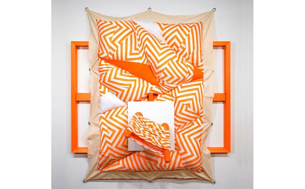 Shaped by childhood desires, the exhibition showcases a selection from Formfit, a series of fabric “paintings” that explore duality of purpose. Acting as an extension of the artist’s body, each work draws upon adolescent memories—those of maps, legs clad in 90s neon, and the cover of Beck’s Midnite Vultures—and propels moments frozen in time into contemporary discourse to create a new narrative..