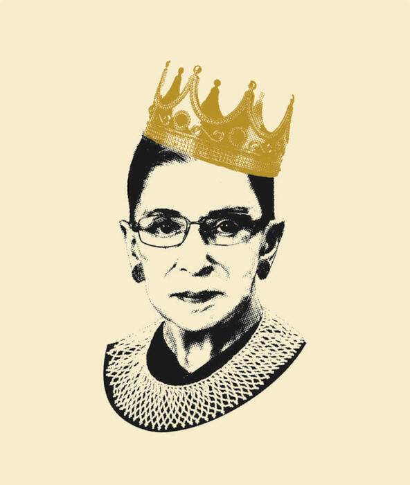 Image: Notorious RBG book cover illustration by Adam Johnson. Courtesy of HarperCollins. Photographs: Crown © by Hurst Photo/Shutterstock; Ruth Bader Ginsburg, Collection of the Supreme Court of the United States.