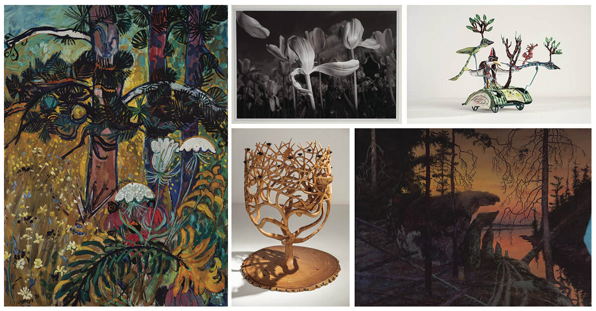 Images: Clockwise: "Meadow (Lorrie Otto's Garden)" (1970) by Ruth Grotenrath, "untitled" (1993) by Jim Brozek, "Freeing the Trees" (unknown) by Bill Reid, "Nin Nenawina" (unknown) by Tom Uttech, "Birds in Tree" (1997) by Xn-trix. From the permanent collection, all rights reserved. Photographs by Robb Quinn.